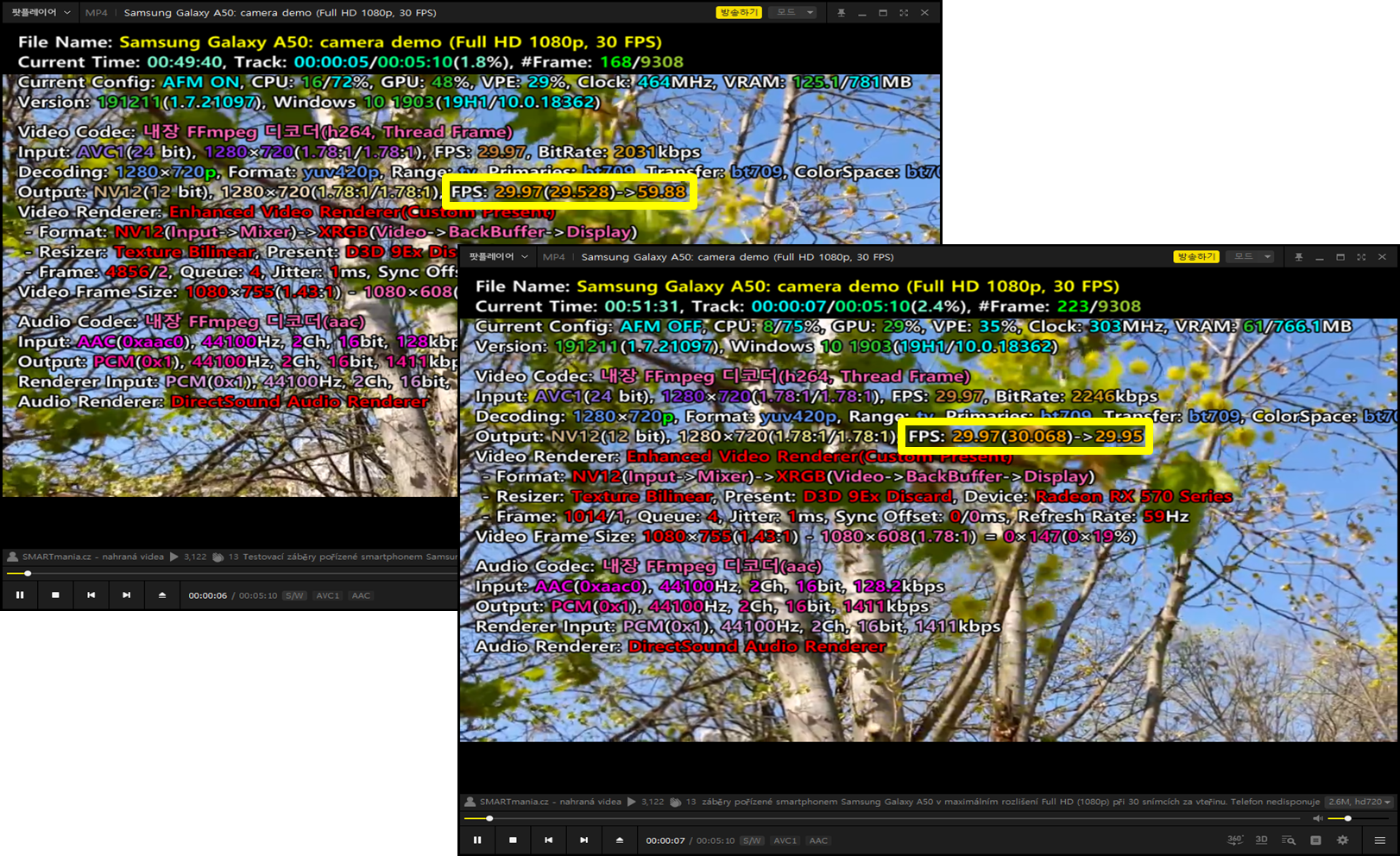 왼쪽이 플루이드 모션이 적용된 동영상, 오른쪽이 플루이드 모션 미적용 동영상의 프레임 상태이다. 원본 30 FPS의 유튜브 동영상을 재생한 상태이며, 왼쪽은 프레임 보간 기능이 적용되어 본래 30 FPS의 동영상이 60 FPS로 향상되어 플레이되고 있음을 확인할 수 있다.