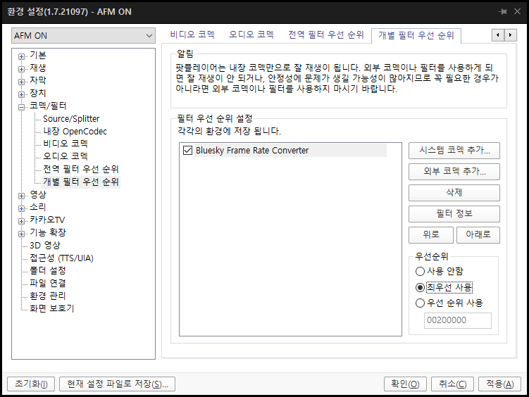 - 필터로 추가된 Bluesky Frame Rate Converter 클릭 > 우선순위 > 최우선 사용 > 적용
