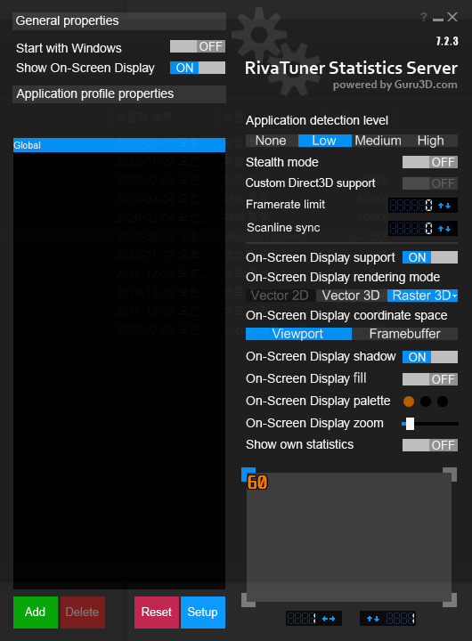 그리고 애프터버너 설치 시 플러그인으로 RivaTuner Statistics Server라는 프로그램을 설치할 수 있는데, 설치하게 되면 게임이나 동영상 내에 프레임 출력 표시 기능이 지원된다. 벤치마킹에 대해 검색해본 분들이라면, 게임 플레이 중 프레임 측정 화면을 보여주는 것을 많이 봤을 텐데, 해당 프로그램을 설치하면 위 사진처럼 실시간 프레임 확인이 가능하다.