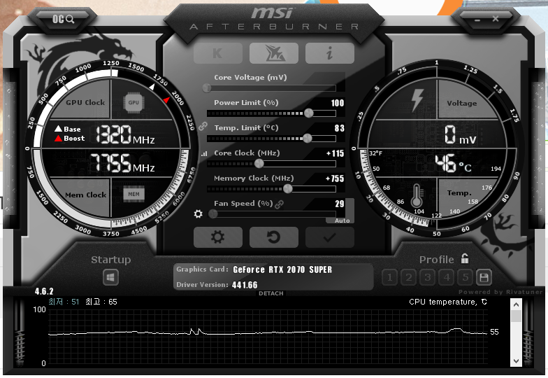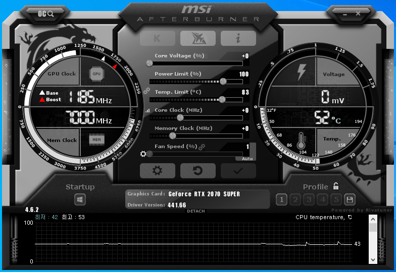 MSI 애프터버너를 통해 코어 및 메모리 클럭을 높이고 벤치마크 측정을 진행했다. 앞서 말했듯이, 전압(Core Voltage)은 변경하지 않았다.