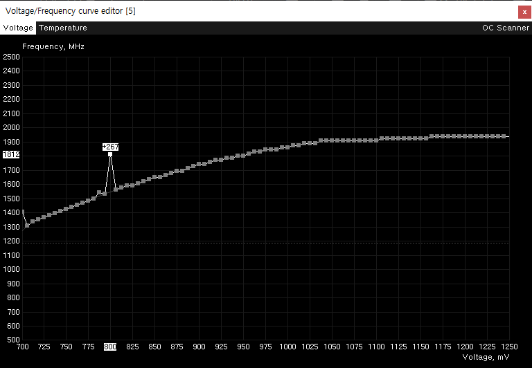 - 또한, 여기서 그래픽카드의 언더 볼팅을 진행하고 싶다면, 해당 메인 창에서 Ctrl + F를 누른 후 Voltage/Frequency curve editor 창이 활성화되면, 해당 팝업창에서 전압(Voltage)과 코어 클럭(Mhz)을 건드려주면 된다.