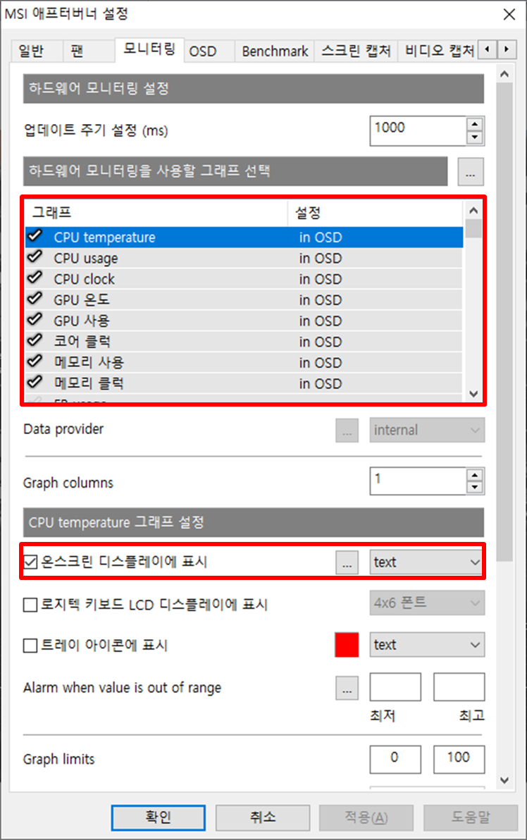 - 모니터링 탭에서 화면에 표시하고 싶은 항목 선택 (검정색 테두리가 나타나면 활성화)